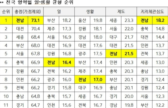 [더조은뉴스]전라남도는 고용노동부가 발표한 ‘2024 일·생활 균형지수’ 평가에서 총점 73.1점(가점 제외)을 받아 전국 17개 시·도 가운데 1위를 기록했다고 밝혔다. 고용부는…