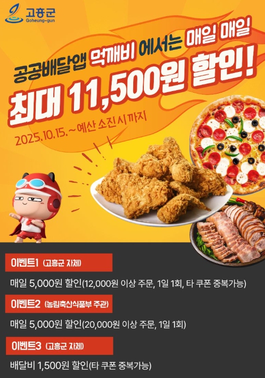 이번 먹깨비 외식비‘반값’ 행사는 고흥군이 ▲매일 5,000원 쿠폰과 ▲배달비 1,500원을 지원하고, 농림축산식품부가 ▲매일 5,000원 할인을 추가로 제공해 최대 11,500원의 할인 혜택을 받을 수 있다.