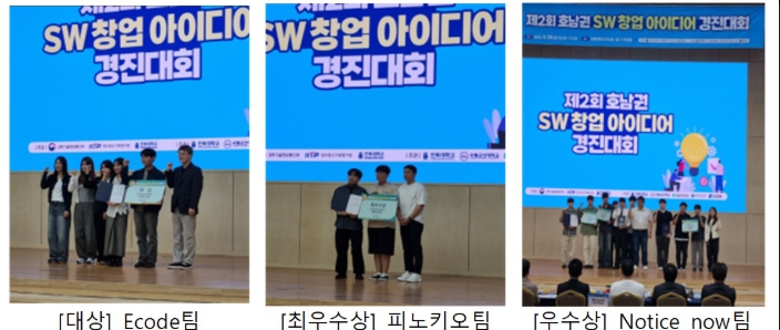전남대 소프트웨어중심대학사업단은 예선을 통해 ▲Ecode팀 ▲피노키오팀 ▲Notice now팀을 본선에 진출시켰으며, 세 팀 모두 SW/AI 기술을 활용한 혁신 창업 아이디어로 심사위원단의 높은 평가를 받았다.