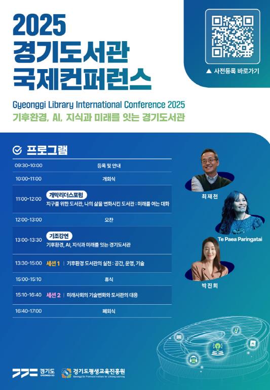 경기도서관 개관(10월 25일)을 기념해 마련된 행사에는 국내외 도서관 전문가, 학계 인사, 활동가, 도민 등이 참여해 기후위기와 인공지능(AI) 시대에 대응하기 위한 도서관의 역할과 발전 전략을 모색할 계획이다.