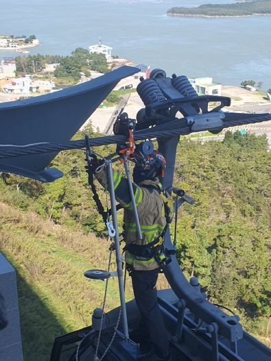 명량해상케이블카 관리부와 진도소방서 119구조대가 함께 참여한 이번 훈련은 ▲케이블카의 작동 원리 교육, ▲전용 구조장비 숙달, ▲케이블카 비상정지 상황 시 인명구조 훈련으로 구성됐다. 특히, 케이블카 케빈이 공중에 정지하는 상황을 가정해 구조대원이 안전장비를 착용하고 케이블 타워를 등반, 요구조자를 신속히 구출하는 과정을 중점적으로 실시했다.