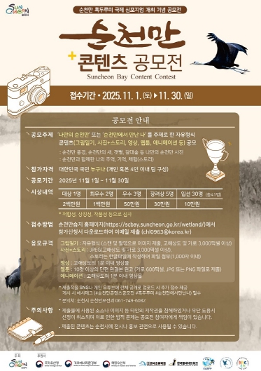 공모 주제는 ‘나만의 순천만’ 또는 ‘순천만에서 만난 나’로, 순천만의 풍경·흑두루미·갯벌·갈대밭 등 직접 촬영한 사진과 일기체 스토리, 또는 웹툰·애니메이션 등 자유 형식의 창작물을 제출할 수 있다. 전 국민 누구나 참여할 수 있으며, 순천만과 함께한 개인의 추억과 체험을 통해 생태도시 순천의 매력을 새롭게 표현할 수 있다.