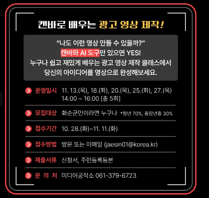 교육 일정은 11월 13일부터 27일까지 총 5회에 걸쳐 오후 2시부터 4시까지 진행되며, 교육생들은 배운 내용을 바탕으로 홍보나 SNS 콘텐츠 제작에 바로 활용할 수 있는 실무 역량을 익히게 된다.