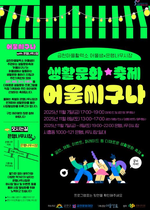 이번 행사는 주민 누구나 예술가가 되어 동아리 활동과 프로그램을 기획하고 참여할 수 있는 생활문화공간 ‘금천마을활력소 어울샘’과 전통시장인 ‘은행나무시장’이 협력해 마련됐다. 금천문화재단은 함께 축제를 준비하며 지역 주민 네트워크 기반의 자생적 생활문화 생태계 조성을 목표로 한다.