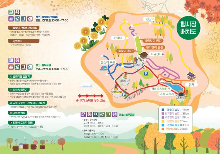 행사 장소는 두 곳에서 진행되며 물맞이골 산림욕장에서는 숲 걷기 스탬프 투어, 숲 해설, 정원 투어가 진행되고, 불무공원에서는 반려식물 만들기, 보물찾기, 숲속 작은 책방, 페이스페인팅, 레트로체험(달고나, 뽑기 등), 김밥만들기 등 아이들과 함께하는 다양한 체험 프로그램이 진행된다.
