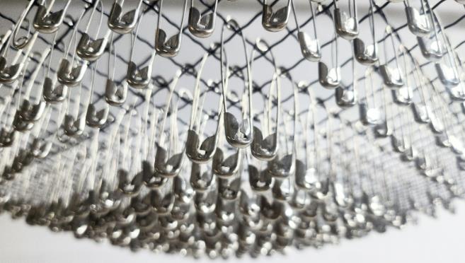 옷핀은 서로 다른 것을 잇고 붙잡는 매개체이자, 관계를 유지하는 인간의 삶을 상징하며, 수많은 핀이 모여 하나의 구조를 이루는 모습은 곧 사회 속 인간관계의 은유다.