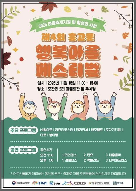 홍주문화관광재단 최건환 대표이사는 “제4회 홍고통 행복마을 페스티벌은 마을 주민이 스스로 만들어가는 진정한 생활문화 축제이자, 세대와 세대가 이어지는 따뜻한 마을공동체”이라며 “문화도시센터는 앞으로도 마을이 중심이 되는 문화 실천이 지속될 수 있도록 적극 지원하겠다”고 말했다.