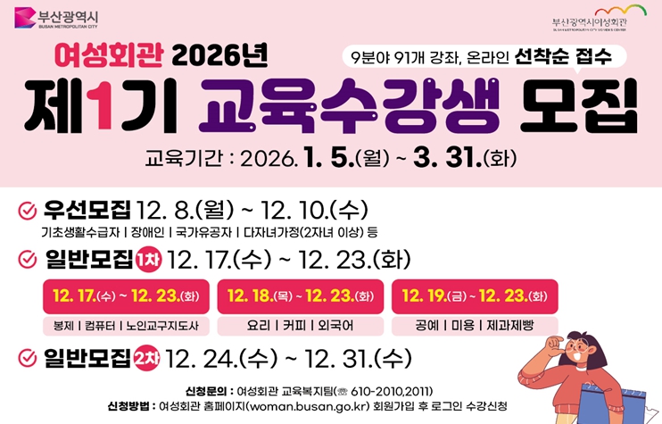 이미경 여성회관장은 “2026년 제1기 교육과정 수강생 모집을 통해 더욱 많은 시민이 배움과 취·창업의 기회를 얻길 바라며, 교육과정에 많은 관심을 부탁드린다”라고 전했다.