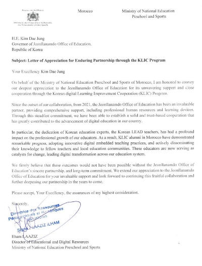 이번 감사 서한은 전라남도교육청이 2021년부터 교육 정보화 지원 사업 (KLIC‧Korean Digital-Learning Improvement Cooperation)을 통해 모로코 교육부와 디지털 교육 분야에서 지속적인 협력을 이어온 데 대한 평가를 담고 있다.