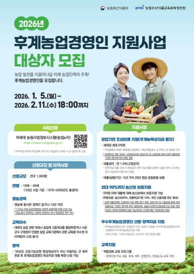 사업 신청은 ‘농업e지’ 홈페이지를 통해 온라인으로만 가능하며, 마감일은 2월 11일 오후 6시 정각이다.