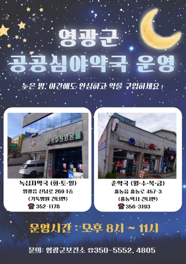이덕희 보건소장은 “공공심야약국 운영을 통해 야간 시간대 의약품 접근성을 높이고, 군민들이 보다 안심하고 생활할 수 있는 의료 환경을 조성해 나가겠다”라고 말했다.