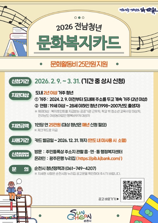 시 관계자는 “전남청년 문화복지카드 지원사업이 일상에 지친 청년들에게 조금이나마 도움이 되길 바란다”며, “다양한 정책이 일상에서 체감될 수 있도록 아낌없는 노력과 지원을 다하겠다
