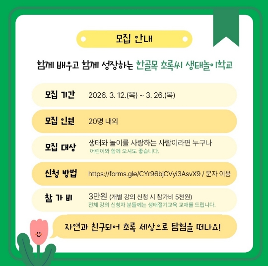 모집기간은 오는 26일까지이며, 생태와 놀이에 관심 있는 누구나 신청 가능하다. 모집인원은 20명 내외로, 참가비는 3만원이며 개별 강의 신청도 가능하다.