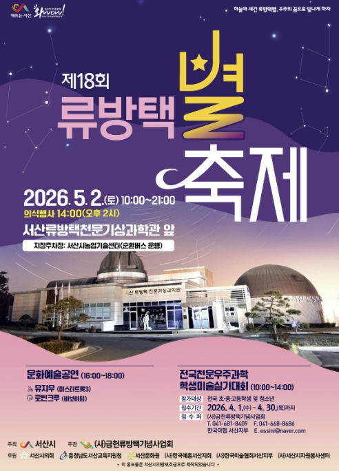 여말선초 서산 출신의 천문학자 류방택을 기리기 위한 이번 축제는 행사 당일 오전 10시부터 오후 9시까지 다채로운 프로그램이 진행된다.