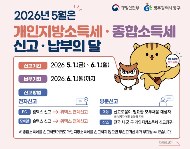 동구는 원활한 신고를 돕기 위해 세무2과 내에 신고 창구를 마련했다. 특히 국세청에서 발송하는 ‘모두채움’ 안내문을 받은 납세자 중 전자 또는 전화 신고가 어려운 경우, 세무2과 방문을 통해 신고 지원을 받을 수 있다.