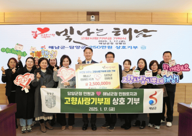 이병노 담양군수는 “고향사랑기부제 상호기부가 추진될 수 있도록 뜻을 모아준 직원들과 해남군 관계자분들에게 감사의 마음을 전한다”라며 “이번 상호기부를 계기로 두 지자체 간의 돈독한 우정과 따뜻한 동행이 계속 이어지기를 바란다”라고 전했다.