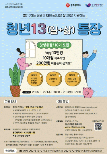 신청을 희망하는 청년은 22일부터 2월3일까지 청년13(일+삶)통장 누리집을 통해 신청하면 된다.