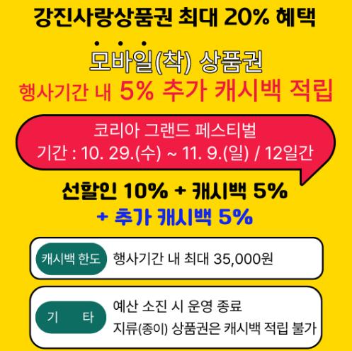 강진군은 모바일(착) 강진사랑상품권의 할인율을 5% 인상해 행사기간에 총 20%(선할인 10% + 캐시백 5% + 추가 캐시백 5%)의 혜택을 지원한다.