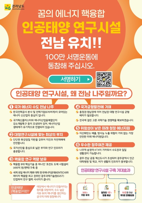 나주시는 과학기술정보통신부 공모사업인 ‘핵융합 핵심기술 및 첨단인프라 구축(가칭 인공태양 연구시설)’ 유치를 위해 범시민 서명운동에 돌입했다고 27일 밝혔다.