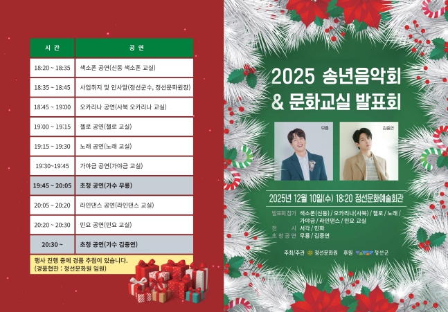 심재복 정선문화원 원장은 “정선 군민들이 함께 모여 따뜻하게 한 해를 마무리하는 시간이 되길 바라며, 수준 높은 공연과 발표를 준비한 만큼 많은 관심과 참여를 부탁드린다”고 전했다.