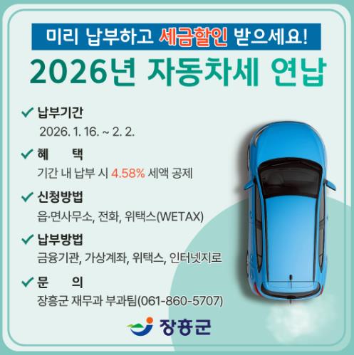 올해도 1월 중 납부 시 4.5%의 세액 공제가 적용되며, 최근 어려운 경제 상황 속에서 가계 부담 완화에 도움이 될 것으로 군은 기대하고 있다.