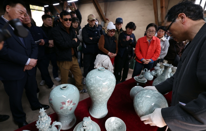 지난 22일 강진군 대구면 고려청자박물관 제2호가마에서 화목가마 요출행사가 열린 가운데 옛 전통방식 그대로 소나무 장작을 이용해 48시간 동안 구워낸 청자를 꺼내고 있다.