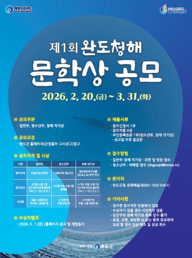 문학상 공모전은 완도가 지닌 ‘치유’를 문학의 영역으로 확장해 완도의 가치를 알리고 완도 문학의 저변을 넓히기 위해 마련됐다.