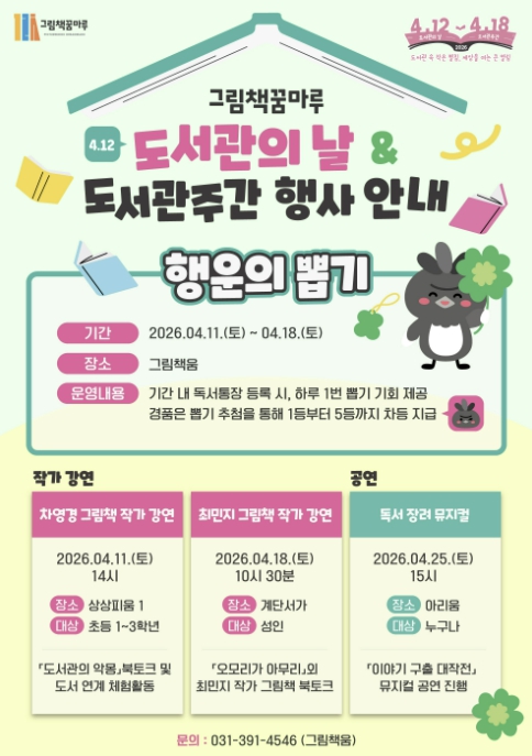 도서관 주간(4월 11일~18일) 동안 그림책꿈마루에서는 ▲작가와의 만남 ▲행운의 뽑기 ▲독서 장려 뮤지컬 공연과 같이 다양한 프로그램이 진행된다.