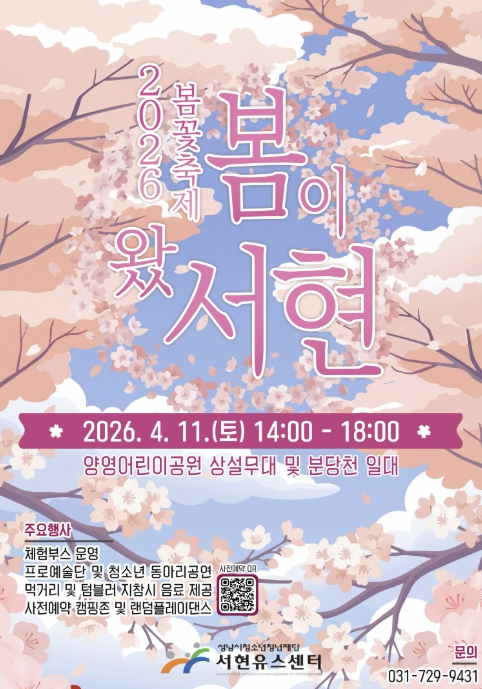 양경석 성남시청소년청년재단 대표이사는 “흐드러지게 핀 벚꽃길 아래에서 청소년·청년과 지역 주민이 소통하며 소중한 추억을 만들기를 바란다”며 “철저한 안전관리를 바탕으로 온 가족이 안심하고 봄의 정취를 만끽할 수 있는 서현유스센터 대표 브랜드 축제로 운영하겠다”고 밝혔다.