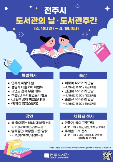이영섭 전주시 도서관평생학습본부장은 “도서관의 날과 도서관 주간을 맞아 마련된 다양한 프로그램을 통해 시민들이 책과 문화가 어우러진 도서관의 매력을 느끼고, 일상 속에서 도서관을 더욱 친숙하게 이용하는 계기가 되기를 바란다”고 말했다.