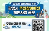 광양 박종수 기자2026. 04.02[더조은뉴스]광양시는 시민이 예산 편성 과정에 직접 참여할 수 있도록 6월 30일까지 ‘2027년 예산 반영 주민참여예산 제안사업’을 집중 공모한다고 밝혔다. 이번 공모는 예산 과정에 다양한 계층의 참여를 확대하고, 시민이 일상에서 느끼는 불편 사항과 지역 발전을 위한 아이디어를 시정에 반영하기 위해 마련됐다. 제안 분야는 ▲청년 희망 및 중장년 행복 기반 조성 ▲여성 안전 및 어르신 건강 도시 지향 사업 ▲안전하고 쾌적한 도시 조성 등 시정 전반이다. 다만 특정 단체나 개인 지원을 목적으로 하거나 이미 시행 중인 사업, 타…